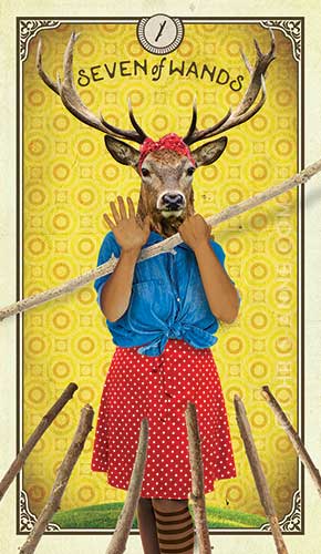 So let's think about this card in general, the seven of wands, and then specifically in this deck. Generally speaking the wands are associated with fire so think passion and energy which can be destructive and creative, something that depends entirely on the perspective of the observers. Sevens are connected to the Chariot (card #7) and the Tower (card #16, 1+6=7) so think profound change, disruption (either creating it or responding to it), and making necessary adjustments the way a chariot driver would be constantly having to do. Sevens may be about contemplation and assessment, but the seven of wands is very much a do something card. All you have to do is look at the picture.